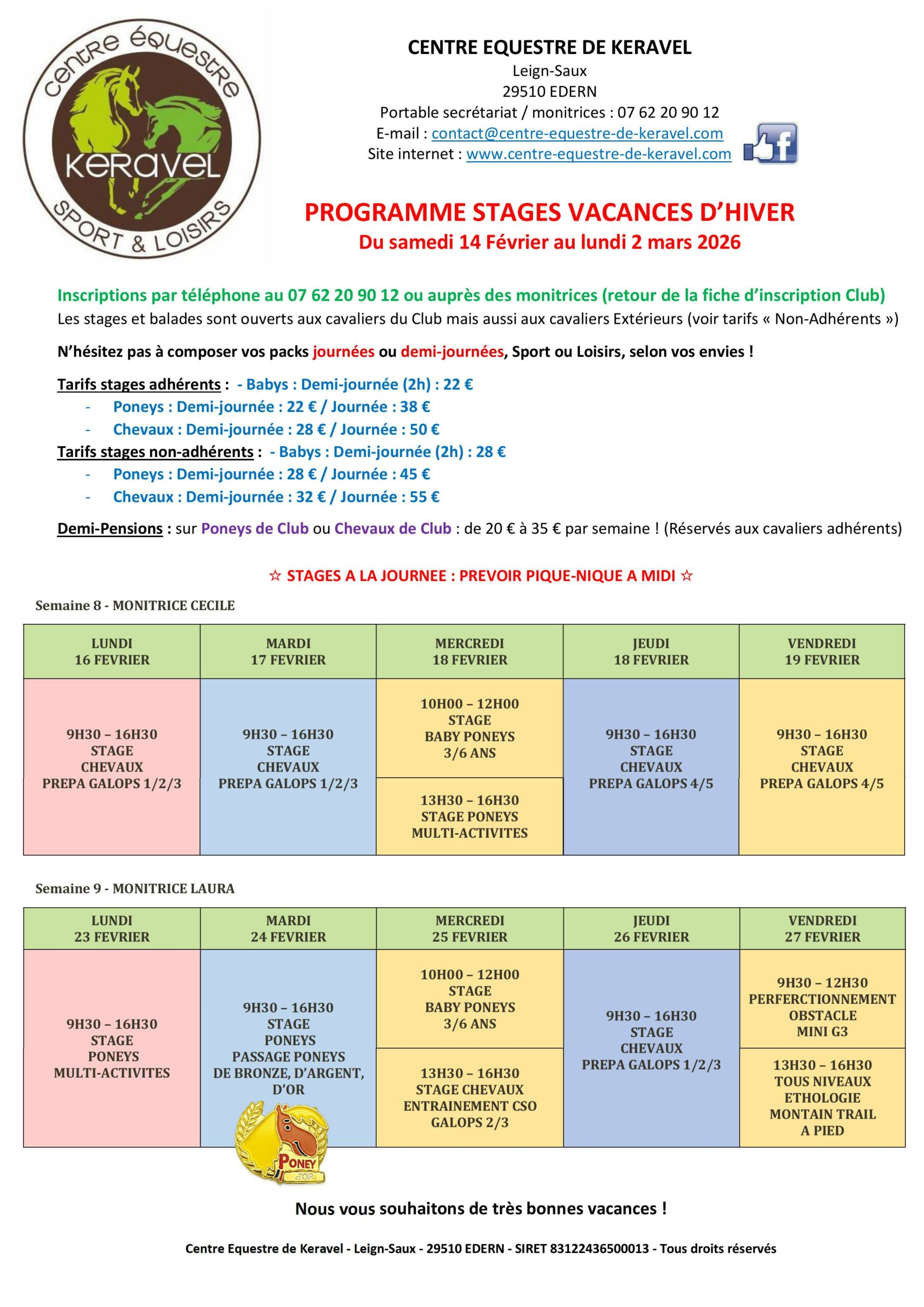 - Pendant les vacances d’Hiver, les 2 semaines,